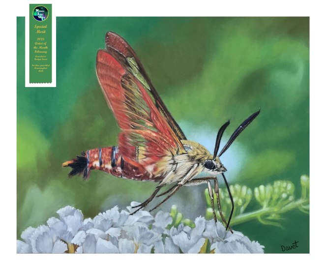 Hummingbird Moth won the Special Merit award in the drawn media category. Hummingbird Month was made with pastels on 10″x8″ dark grey Pastelmat. Reference photo by Don Barrick. This is the second award that this artwork has earned.