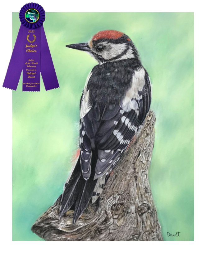 Woodpecker on Perch won the Judge’s Choice award in the drawn media category. Woodpecker on Perch was made with pastels on 8″x10″ dark grey Pastelmat. Reference photo by Gill Merritt. This is the third award that this artwork has earned. Though I get attached to most of my artwork, at this time I refuse to sell this artwork. Though I won’t sell the original, you can purchase professional art prints off my art prints for sale page on this website. Direct link to my entry: https://www.northernlightartgallery.com/image-gallery/bridget-davet-woodpecker