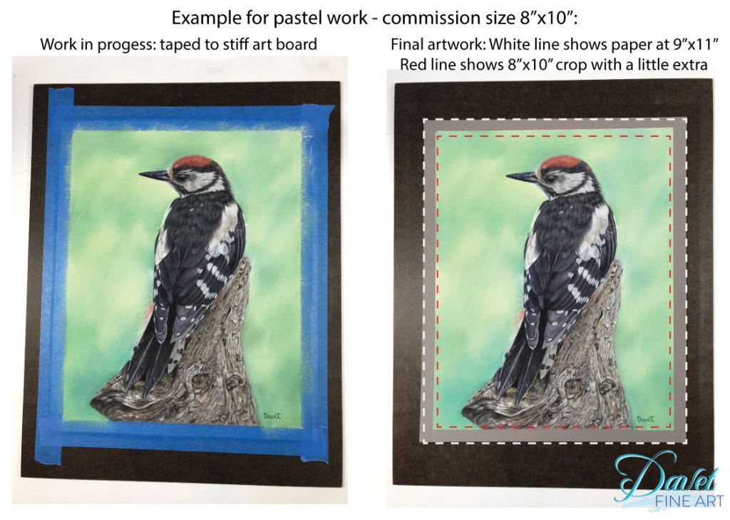 All pastel drawing are on Pastelmat paper. Pastelmat is a thick paper that feels like velvet and is the industry standard for pastel drawings. I hand cut the paper to size for each commission. I can do any exact size you’d like up to 16”x20”. I always cut my paper 1” larger than the commission size. This gives me room to tape the paper down to my drawing board. When drawing the artwork, I always extend my drawing just a little bigger than the chosen size so that when the drawing is framed, there won’t be any areas on the edge where the paper might show. In the photo below, you can see where my drawing is taped down to my art board. The photo on the right shows how an 8”x10” drawing is on 9”x11” paper, but when you put it into a frame (shown by the computer generated red line), a little of the drawing will be hidden by the frame. All artwork is made with lightfast pastels. I have my mats custom cut to the opening of the size ordered. The opening of standard mats at the store will be about 1/2″ smaller.