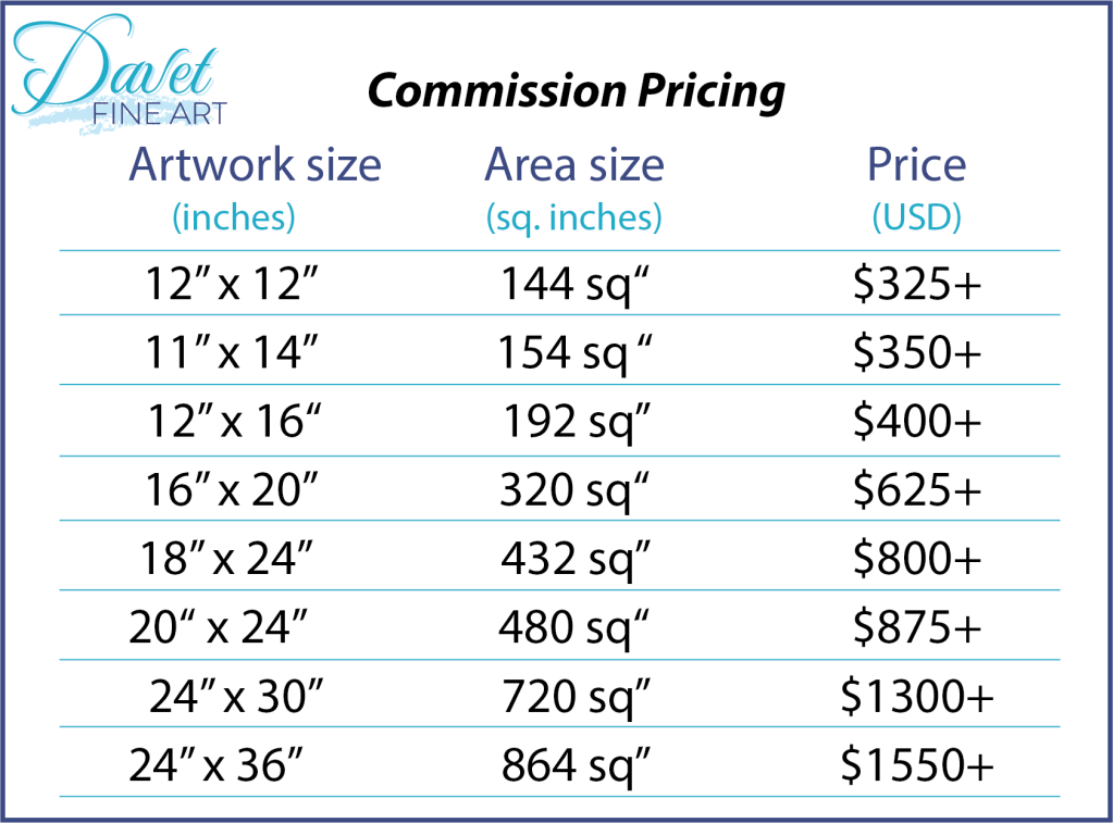 All prices are in US dollars. These are the starting pricing based off of simple backgrounds, one subject, basic head shot portraits, etc. Detailed whole body portraits, detailed backgrounds and complicated extras (such as a detailed item within the picture) will increase the price, please email me for a quote. As of 2025, the min. size I’ll work on is 12″x12″. It is just too difficult to do such details on smaller sizes.